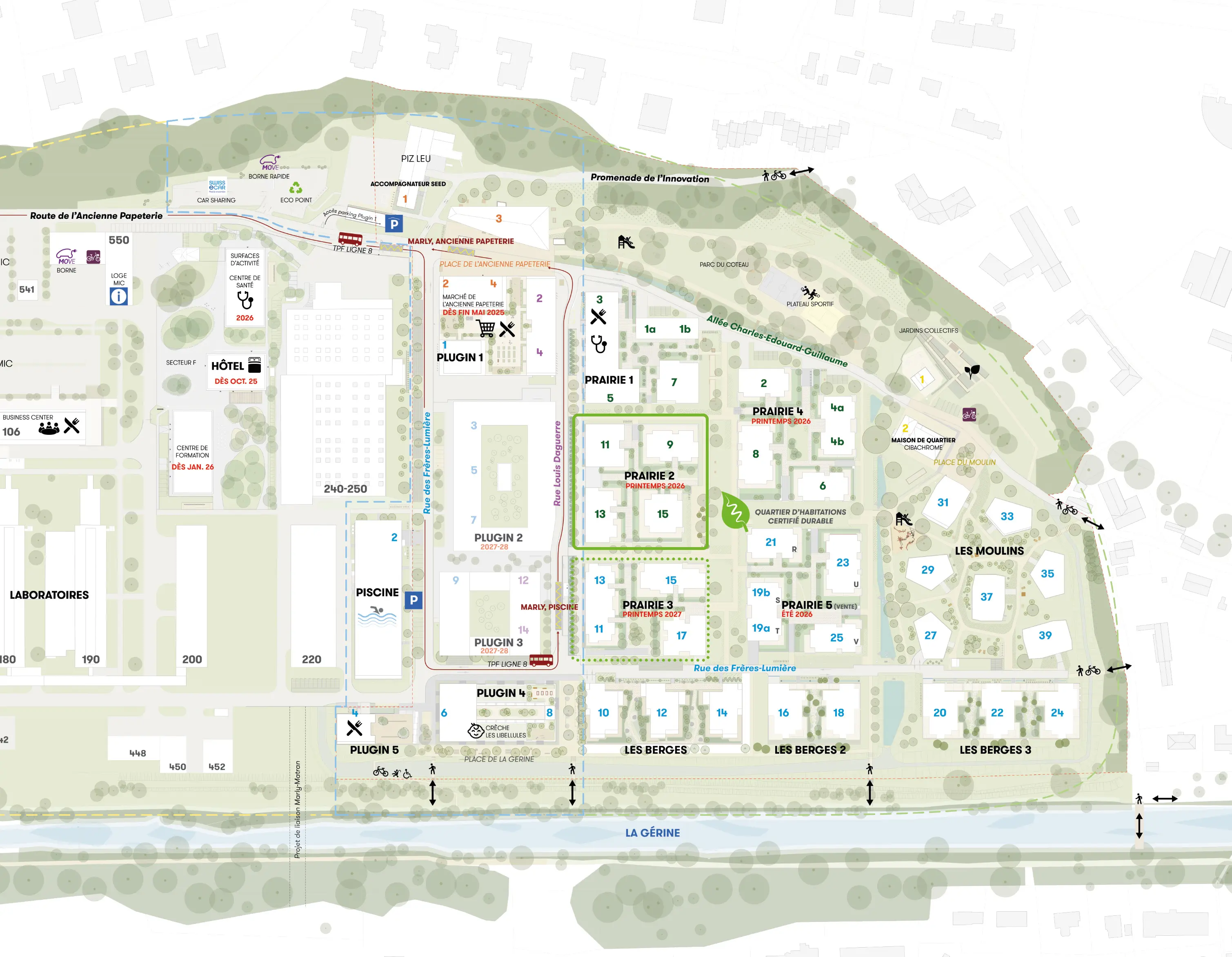 Attenant au pôle d’entreprises, l’écoquartier de l’Ancienne Papeterie a déjà vu plus de 500 logements sortir de terre depuis fin 2019. Certifié SEED, ce quartier durable au fort potentiel offre déjà une qualité de vie optimisée à ses résident.e.s.