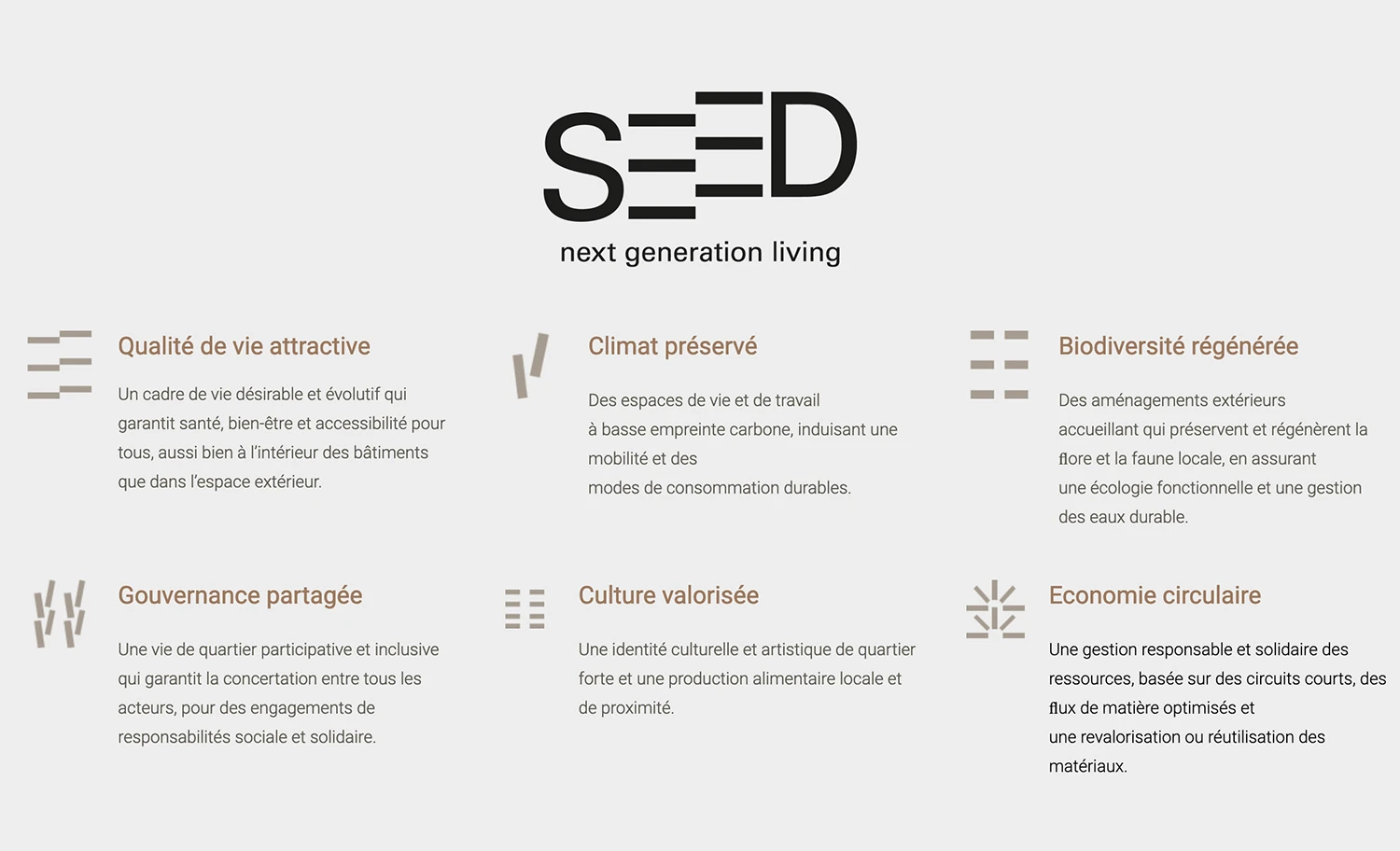 Le respect et la préservation de la nature sont au cœur de nos préoccupations. Créer un futur durable nécessite des mesures et des initiatives écologiques, économiques et sociales. Le concept d’écoquartier est séduisant mais ne répond parfois pas totalement aux exigences. La certification SEED crédibilise notre approche et garantit un suivi régulier sur le long terme.